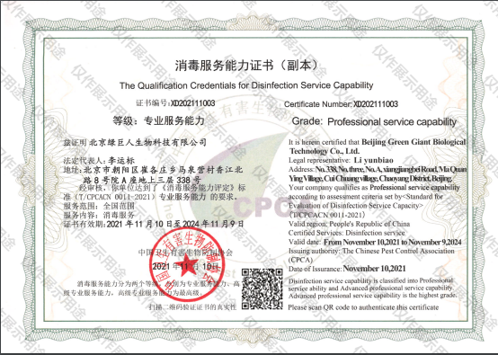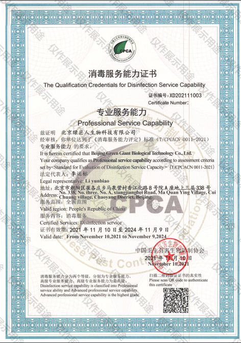 2021年11月12日,北京綠巨人獲得由中國有害生物防制協(xié)會頒發(fā)的《消毒服務(wù)能力證書》,這是繼獲得《出入境檢疫處理單位核準(zhǔn)證書》之后,北京綠巨人在消毒領(lǐng)域所獲得的又一專業(yè)認(rèn)可。