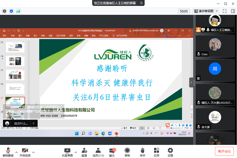線上方面,北京綠巨人攜手北京市左家莊街道及崔各莊地區(qū),于6月6日當(dāng)天,開(kāi)展 “6月6日世界害蟲日主題消殺四害講座” 線上培訓(xùn),由沈陽(yáng)農(nóng)業(yè)大學(xué)植物保護(hù)專業(yè)錢海濤博士主講,傳播科學(xué)防制理念,消除疾病傳播危害,提升轄區(qū)內(nèi)單位、商戶及居民對(duì)有害生物防制的正確認(rèn)知、藥物安全管理及應(yīng)用、應(yīng)急處理方法及病媒防制專業(yè)公司如何選擇等消殺知識(shí),共計(jì)參加培訓(xùn)人數(shù)達(dá)300人,轄區(qū)單位和居民熱烈響應(yīng),在“專家問(wèn)答環(huán)節(jié)中”,屏幕上布滿了居民們迫切想要了解的各種消殺問(wèn)題,錢博士一一解決了他們居家和辦公中苦惱的防制四害的問(wèn)題。