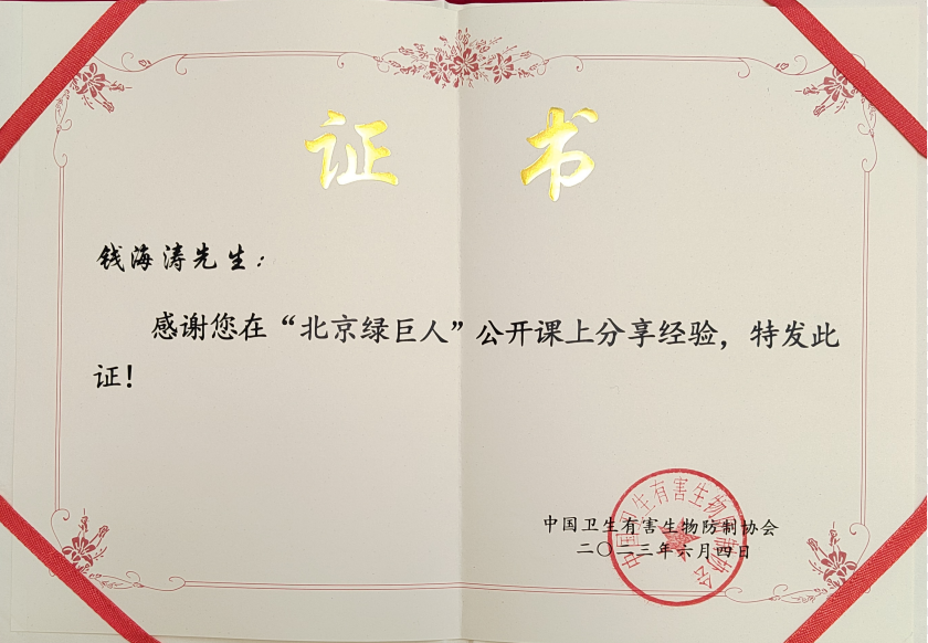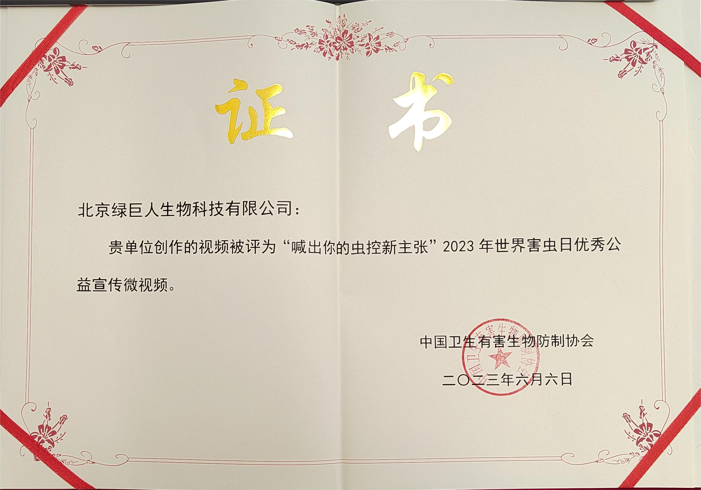 “北京綠巨人”在2023年6月6日世界害蟲(chóng)日全國(guó)公益主場(chǎng)活動(dòng)中,榮獲“2023年世界害蟲(chóng)日,優(yōu)秀公益宣傳微視頻”稱(chēng)號(hào)。