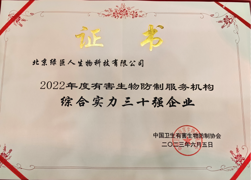 北京綠巨人生物科技有限公司在2023年全國(guó)消殺大會(huì)上,蟬聯(lián)“年度有害生物防制服務(wù)機(jī)構(gòu)綜合實(shí)力30強(qiáng)企業(yè)”稱(chēng)號(hào),贏得了專(zhuān)家、領(lǐng)導(dǎo)單位和客戶(hù)的一致好評(píng)。“北京綠巨人”已連續(xù)多年獲得本殊榮,是社會(huì)各界對(duì)北京綠巨人生物科技有限公司在PCO領(lǐng)域的實(shí)力和引領(lǐng)地位的充分肯定。
